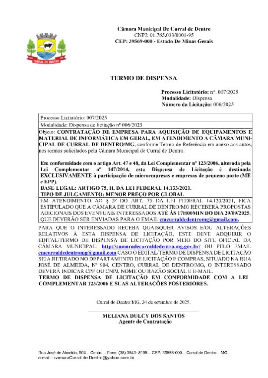 A Câmara Municipal de Curral de Dentro/MG torna público o Processo Licitatório nº 007/2025, na modalidade Dispensa de Licitação nº 006/2025, com base no Art. 75, inciso II da Lei Federal 14.133/2021, destinado à contratação de empresa para a aquisição de equipamentos e materiais de informática em geral a fim de atender às necessidades da Câmara Municipal.