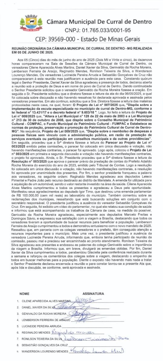 Aos 05 (Cinco) dias do mês de junho do ano de 2025 (Dois Mil e Vinte e cinco), às dezenove horas compareceram na Sala de Sessões da Câmara Municipal de Curral de Dentro, os vereadores Cilene Aparecida Alves Martins, Daniel Xavier da Silva, Genivaldo da Rocha Moreira, Leniberson Ferreira de Araújo, Reginaldo Mendes, Ronilson Teixeira da Silva, e Wanderson Lourenço Mendes. Os vereadores Lucineide Pereira Arruda e Sebastião Gonçalves da Cruz não compareceram à esta reunião mas justificaram a ausência para esta casa. Constando quórum legal o Senhor Presidente, Daniel Xavier da Silva agradeceu a presença de todos, declarou aberta a reunião sob a proteção de Deus e em nome do povo de Curral de Dentro. Dando continuidade o Senhor Presidente solicitou que o vereador Genivaldo da Rocha Moreira fizesse a oração. Em seguida o Sr. Presidente solicitou que a diretora fizesse a leitura da ata do dia 06/05/2025, a qual foi colocada sobre discussão e não havendo ressalvas foi declarada aprovada e assinada pelos vereadores presentes. Em ato continuo, solicitou que a Sra. Diretora fizesse a leitura das mateiras protocoladas nesta casa, na qual, foram: O Projeto de Lei n° 007/2025 que, "Dispõe sobre a implementação da escuta especializada no município de curral de Dentro-MG, conforme a lei federal n° 13.431/17 e o decreto federal n° 9.603/18 ". Logo, foi feito a leitura do Projeto de Lei n° 008/2025 que, "Altera a Lei Municipal n° 128 de 22 de maio de 2003 e a Lei Municipal n° 213 de 30 de outubro de 2008, que dispõe sobre o Conselho Municipal de Patrimônio Cultural - COMPAC, o Fundo Municipal de Patrimônio Cultural - FUMPAC e Estabelece as normas de proteção, preservação e promoção do Patrimônio Cultural de Curral de Dentro- MG". Na sequência, Projeto de Lei 009/2025 que, "Dispõe sobre o reembolso de despesas a pessoas físicas sem vinculo com a administração pública, em razão da prestação de serviços eventuais ou participação em conselhos municipais e da outras providências”. Em seguida, procedeu que a Sr3 diretora fizesse a leitura do Parecer ao Projeto de Lei n° 003/2025 emitido pelas comissões, o parecer foi colocado em única discussão e votação, não havendo manifestações contrarias, o parecer foi aprovado. Logo após, colocou o Projeto de Lei n° 003/2025 em primeira e segunda discussão e votação não havendo manifestações contrarias, o projeto foi aprovado. Ainda, o Sr. Presidente procedeu que a Sra diretora fizesse a leitura da Resolução n° 003/2025 que aprova o parecer prévio da prestação de contas do Prefeito Adaildo