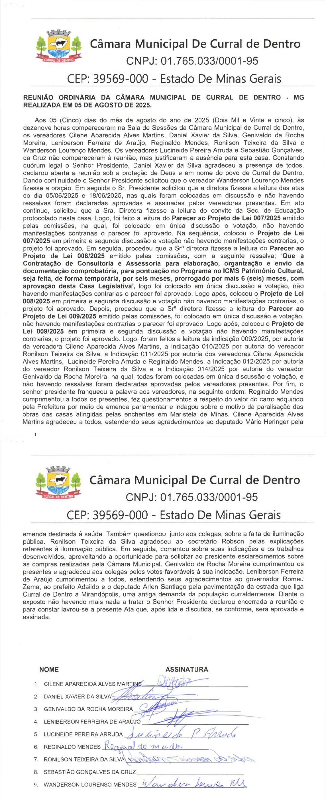 Aos 05 (Cinco) dias do mês de agosto do ano de 2025 (Dois Mil e Vinte e cinco), àsdezenove horas compareceram na Sala de Sessões da Câmara Municipal de Curral de Dentro, os vereadores Cilene Aparecida Alves Martins, Daniel Xavier da Silva, Genivaldo da Rocha Moreira, Leniberson Ferreira de Araújo, Reginaldo Mendes, Ronilson Teixeira da Silva e Wanderson Lourenço Mendes. Os vereadores Lucineide Pereira Arruda e Sebastião Gonçalves, da Cruz não compareceram à reunião, mas justificaram a ausência para esta casa. Constando quórum legal o Senhor Presidente, Daniel Xavier da Silva agradeceu a presença de todos, declarou aberta a reunião sob a proteção de Deus e em nome do povo de Curral de Dentro.Dando continuidade o Senhor Presidente solicitou que o vereador Wanderson Lourenço Mendes fizesse a oração. Em seguida o Sr. Presidente solicitou que a diretora fizesse a leitura das atas do dia 05/06/2025 e 18/06/2025, nas quais foram colocadas em discussão e não havendo ressalvas foram declaradas aprovadas e assinadas pelos vereadores presentes. Em ato continuo, solicitou que a Sra. Diretora fizesse a leitura do convite da Sec. de Educação protocolado nesta casa. Logo, foi feito a leitura do Parecer ao Projeto de Lei 007/2025 emitido pelas comissões, na qual, foi colocado em única discussão e votação, não havendo manifestações contrarias o parecer foi aprovado. Na sequência, colocou o Projeto de Lei 007/2025 em primeira e segunda discussão e votação não havendo manifestações contrarias, o projeto foi aprovado. Em seguida, procedeu que a Sra diretora fizesse a leitura do Parecer ao Projeto de Lei 008/2025 emitido pelas comissões, com a seguinte ressalva; ‘Que a Contratação de Consultoria e Assessoria para elaboração, organização e envio da documentação comprobatória, para pontuação no Programa no ICMS Patrimônio Cultural, seja feita, de forma temporária, por seis meses, prorrogado por mais 6 (seis) meses, com aprovação desta Casa Legislativa’, logo foi colocado em única discussão e votação, não havendo manifestações contrarias o parecer foi aprovado. Logo após, colocou o Projeto de Lei 008/2025 em primeira e segunda discussão e votação não havendo manifestações contrarias, o projeto foi aprovado. Depois, procedeu que a Sra diretora fizesse a leitura do Parecer ao Projeto de Lei 009/2025 emitido pelas comissões, foi colocado em única discussão e votação, não havendo manifestações contrarias o parecer foi aprovado. Logo após, colocou o Projeto de Lei 009/2025 em primeira e segunda discussão e votação não havendo manifestações contrarias, o projeto foi aprovado. Logo, foram feitos a leitura da indicação 009/2025, por autoria da vereadora Cilene Aparecida Alves Martins, a Indicação 010/2025 por autoria do vereador Ronilson Teixeira da Silva, a Indicação 011/2025 por autoria dos vereadores Cilene Aparecida Alves Martins, Lucineide Pereira Arruda e Reginaldo Mendes, a Indicação 012/2025 por autoria do vereador Ronilson Teixeira da Silva e a Indicação 014/2025 por autoria do vereador Genivaldo da Rocha Moreira, na qual, todas foram colocadas em única discussão e votação, e não havendo ressalvas foram declaradas aprovadas pelos vereadores presentes. Por fim, o senhor presidente franqueou a palavra aos vereadores, na seguinte ordem: Reginaldo Mendes cumprimentou a todos os presentes, fez questionamentos a respeito do valor do carro adquirido pela Prefeitura por meio de emenda parlamentar e indagou sobre o motivo da paralisação das obras das casas atingidas pelas enchentes em Maristela de Minas. Cilene Aparecida Alves Martins agradeceu a todos, estendendo seus agradecimentos ao deputado Mário Heringer pela emenda destinada à saúde. Também questionou, junto aos colegas, sobre a falta de iluminação pública. Ronilson Teixeira da Silva agradeceu ao secretário Robson pelas explicações referentes à iluminação pública. Em seguida, comentou sobre suas indicações e os trabalhos desenvolvidos, aproveitando a oportunidade para solicitar ao presidente esclarecimentos sobre as compras realizadas pela Câmara Municipal. Genivaldo da Rocha Moreira cumprimentou os presentes e agradeceu aos colegas pelos votos favoráveis à sua indicação. Leniberson Ferreira de Araújo cumprimentou a todos, estendendo seus agradecimentos ao governador Romeu Zema, ao prefeito Adaildo e o deputado Arlen Santiago pela pavimentação da estrada que liga Curral de Dentro a Mirandópolis, uma antiga demanda da população curraldentense. Diante o exposto não havendo mais nada a tratar o Senhor Presidente declarou encerrada a reunião e para constar lavrou-se a presente Ata que, após lida e discutida, se conforme, será aprovada e assinada.