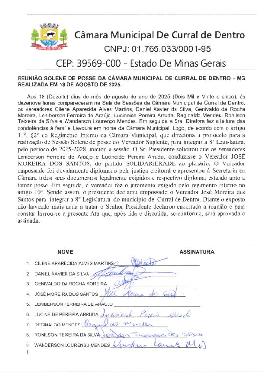 Aos 18 (Dezoito) dias do mês de agosto do ano de 2025 (Dois Mil e Vinte e cinco), às dezenove horas compareceram na Sala de Sessões da Câmara Municipal de Curral de Dentro, os vereadores Cilene Aparecida Alves Martins, Daniel Xavier da Silva, Genivaldo da Rocha Moreira, Leniberson Ferreira de Araújo, Lucineide Pereira Arruda, Reginaldo Mendes, Ronilson Teixeira da Silva e Wanderson Lourenço Mendes. Em seguida a Sra. Diretora fez a leitura das condolências à família Lavoura em nome da Câmara Municipal. Logo, de acordo com o artigo 11°, §2° do Regimento Interno da Câmara Municipal, que direciona o protocolo para a realização de Sessão Solene de posse do Vereador Suplente, para integrar a 8a Legislatura, pelo período de 2025-2028, iniciou a sessão. O Sr. Presidente solicitou que os vereadores Leniberson Ferreira de Araújo e Lucineide Pereira Arruda, conduzisse o Vereador JOSÉ MOREIRA DOS SANTOS, do partido SOLIDARIERADE ao plenário. O Vereador empossado foi devidamente diplomado pela justiça eleitoral e apresentou à Secretaria da Câmara todos seus documentos legalmente exigidos e respectivo diploma, estando apto a tomar posse. Em seguida, o vereador fez o juramento exigido pelo regimento interno no artigo 10°. Sendo assim, o presidente declarou empossado o Vereador José Moreira dos Santos para integrar a 8o Legislatura do município de Curral de Dentro. Diante o exposto não havendo mais nada a tratar o Senhor Presidente declarou encerrada a reunião e para constar lavrou-se a presente Ata que, após lida e discutida, se conforme, será aprovada e assinada.