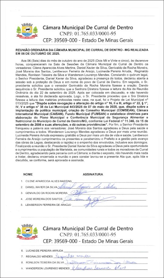 Aos 06 (Seis) dias do mês de outubro do ano de 2025 (Dois Mil e Vinte e cinco), às dezenove horas, compareceram na Sala de Sessões da Câmara Municipal de Curral de Dentro os vereadores: Cilene Aparecida Alves Martins, Daniel Xavier da Silva, Genivaldo da Rocha Moreira, José Moreira dos Santos, Leniberson Ferreira de Araújo, Lucineide Pereira Arruda, Reginaldo Mendes, Ronilson Teixeira da Silva e Wanderson Lourenço Mendes. Constando o quórum legal, o Senhor Presidente, Daniel Xavier da Silva, agradeceu a presença de todos, declarou aberta a sessão sob a proteção de Deus e em nome do povo de Curral de Dentro. Em seguida, o Sr. presidente solicitou que o vereador Genivaldo da Rocha Moreira fizesse a oração. Dando sequência o Sr. Presidente solicitou que a Senhora Diretora fizesse a leitura da Ata da Reunião Ordinária do dia 22 de setembro de 2025. Após ser colocada em discussão, e não havendo ressalvas, a ata foi declarada aprovada. Logo, o Sr. Presidente procedeu que a Sra Diretora fizesse a leitura das matérias protocolas nesta casa, na qual, foi o Projeto de Lei Municipal n° 013/2025 que "Dispõe sobre revogação e alteração do artigo n° 16, II e III, artigo n° 22, § 1º, IV, V e artigo n° 38 da Lei Municipal 443/2025 de 07 de maio de 2025, que, dispõe sobre a implantação da política municipal, criação do Conselho Municipal (COMSEAN), Câmara Inter setorial Municipal (CAISAN), Fundo Municipal (FUMSAN) e estabelece diretrizes para elaboração do Plano Municipal e Conferência Municipal de Segurança Alimentar e Nutricional do Município de Curral de Dentro/MG, conforme Lei Federal n° 11.346, de 15 de setembro de 2006 e suas alterações, e dá outras providências". Por fim, o Senhor Presidente franqueou a palavra aos vereadores: José Moreira dos Santos agradeceu a Deus pela saúde e cumprimentou a todos. Wanderson Lourenço Mendes agradeceu a Deus por mais uma reunião. Lucineide Pereira Arruda expressou gratidão a Deus por mais um dia de vida e saúde. Leniberson Ferreira de Araújo cumprimentou os presentes e parabenizou o Prefeito e a gestão pelo avanço das obras da Lagoa, destacando a rapidez e o empenho dos envolvidos, inclusive aos domingos. Finalizando a reunião o Sr. Presidente Daniel Xavier da Silva agradeceu a Deus pela oportunidade e cumprimentou a população de Maristela, as comunidades rurais e todos os moradores de Curral de Dentro, agradecendo pela parceria com a Câmara; e diante o exposto, não havendo mais nada a tratar, declarou encerrada a reunião e para constar lavrou-se a presente Ata que, após lida e discutida, se conforme, será aprovada e assinada.