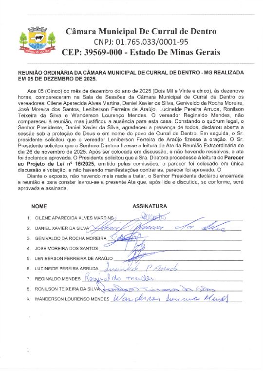 Aos 05 (Cinco) do mês de dezembro do ano de 2025 (Dois Mil e Vinte e cinco), às dezenove horas, compareceram na Sala de Sessões da Câmara Municipal de Curral de Dentro os vereadores: Cilene Aparecida Alves Martins, Daniel Xavier da Silva, Genivaldo da Rocha Moreira, José Moreira dos Santos, Leniberson Ferreira de Araújo, Lucineide Pereira Arruda, Ronilson Teixeira da Silva e Wanderson Lourenço Mendes. O vereador Reginaldo Mendes, não compareceu à reunião, mas justificou a ausência para esta casa. Constando o quórum legal, o Senhor Presidente, Daniel Xavier da Silva, agradeceu a presença de todos, declarou aberta a sessão sob a proteção de Deus e em nome do povo de Curral de Dentro. Em seguida, o Sr. presidente solicitou que o vereador Leniberson Ferreira de Araújo fizesse a oração. O Sr. Presidente solicitou que a Senhora Diretora fizesse a leitura da Ata da Reunião Extraordinária do dia 26 de novembro de 2025. Após ser colocada em discussão, e não havendo ressalvas, a ata foi declarada aprovada. O Presidente solicitou que a Sra. Diretora procedesse à leitura do Parecer ao Projeto de Lei n°16/2025, emitido pelas comissões, o parecer foi colocado em única discussão e votação, e não havendo manifestações contrarias, parecer foi aprovado. O Diante o exposto, não havendo mais nada a tratar, o Senhor Presidente declarou encerrada a reunião e para constar lavrou-se a presente Ata que, após lida e discutida, se conforme, será aprovada e assinada.