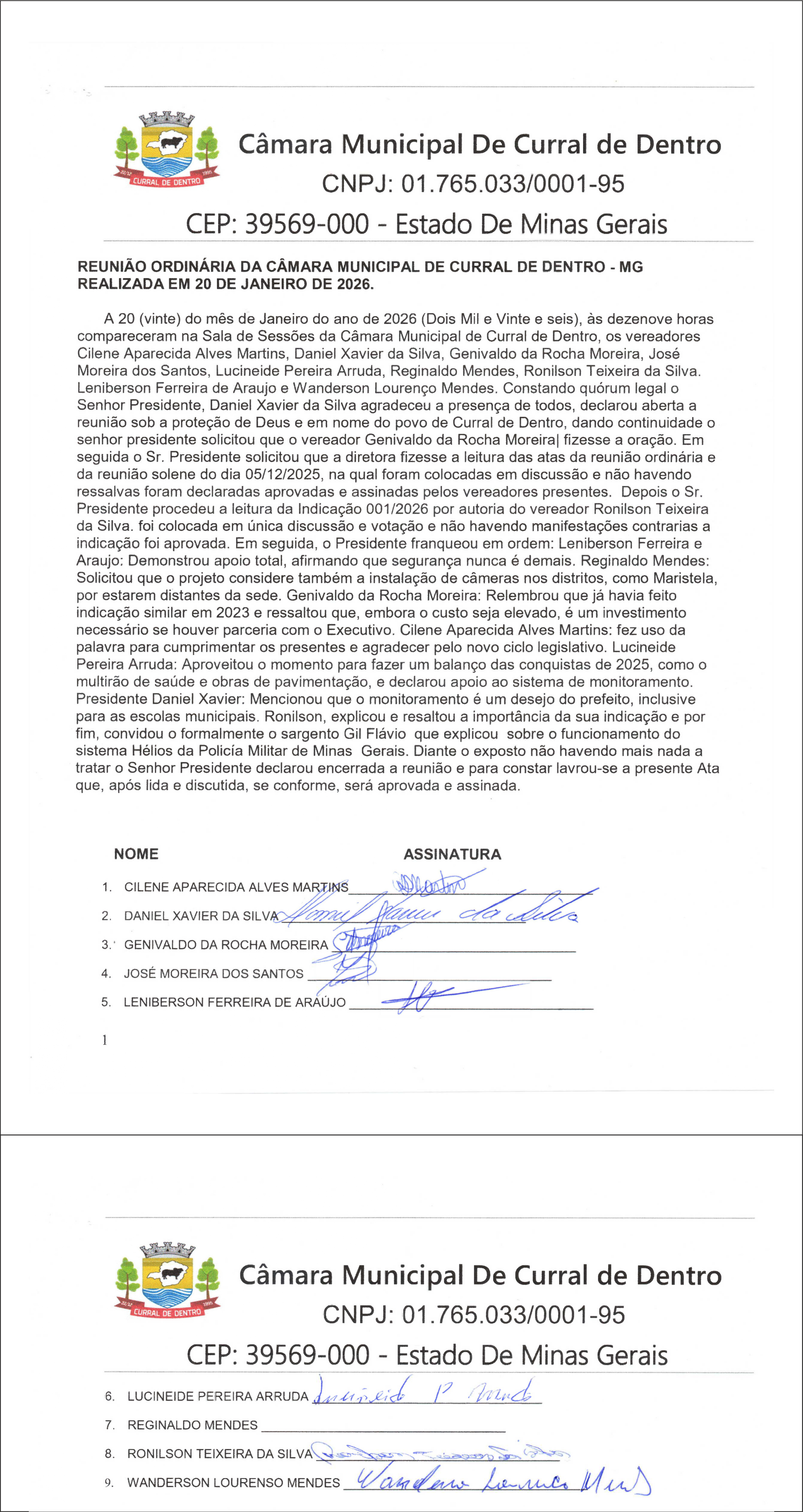 A 20 (vinte) do mês de Janeiro do ano de 2026 (Dois Mil e Vinte e seis), às dezenove horas compareceram na Sala de Sessões da Câmara Municipal de Curral de Dentro, os vereadores Cilene Aparecida Alves Martins, Daniel Xavier da Silva, Genivaldo da Rocha Moreira, José Moreira dos Santos, Lucineide Pereira Arruda, Reginaldo Mendes, Ronilson Teixeira da Silva. Leniberson Ferreira de Araújo e Wanderson Lourenço Mendes. Constando quórum legal o Senhor Presidente, Daniel Xavier da Silva agradeceu a presença de todos, declarou aberta a reunião sob a proteção de Deus e em nome do povo de Curral de Dentro, dando continuidade o senhor presidente solicitou que o vereador Genivaldo da Rocha Moreira| fizesse a oração. Em seguida o Sr. Presidente solicitou que a diretora fizesse a leitura das atas da reunião ordinária e da reunião solene do dia 05/12/2025, na qual foram colocadas em discussão e não havendo ressalvas foram declaradas aprovadas e assinadas pelos vereadores presentes. Depois o Sr.