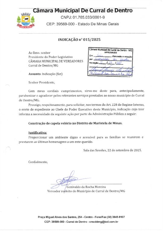 INDICAÇÃO CÂMARA MUNICIPAL DE CURRAL DE DENTRO - MG 22 de setembro de 2025