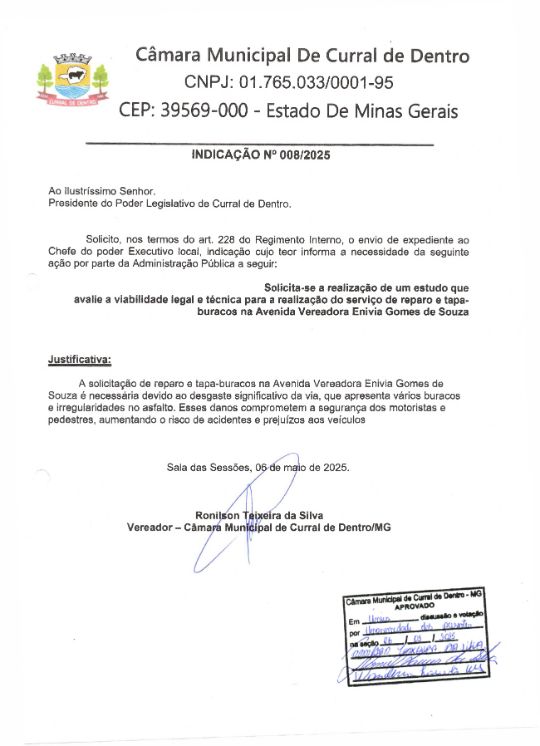 INDICAÇÃO CÂMARA MUNICIPAL DE CURRAL DE DENTRO - MG 06 de maio de 2025.
