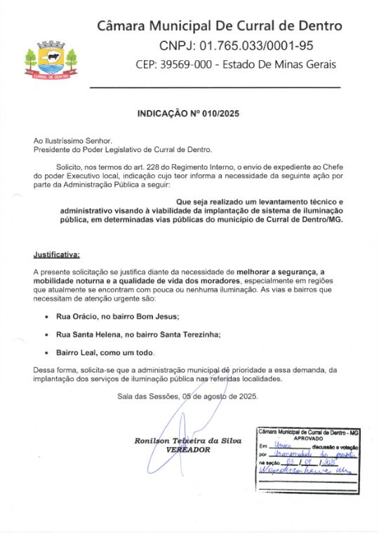 INDICAÇÃO CÂMARA MUNICIPAL DE CURRAL DE DENTRO - MG 05 de agosto de 2025